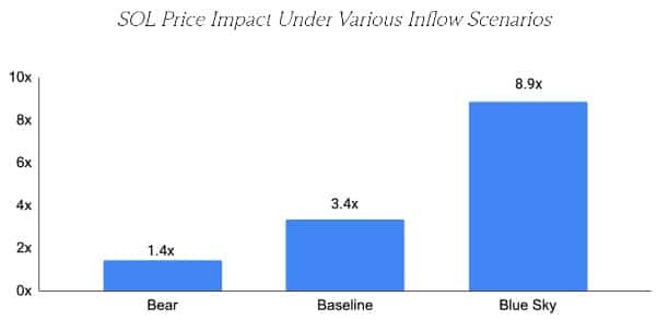 Źródło: https://www.gsr.io/reports/is-solana-eft-next/Z kolei analitycy portalu Finbold wygenerowali prognozy dla SOL przy pomocy ChatGPT-4o. Według wariantu ostrożnego, Solana, przy w miarę sprzyjających warunkach, może osiągnąć do 195 dolarów. Scenariusz pośredni zakłada, iż ETF SOL przejmie wpływy od BTC ETF, dzięki czemu token osiągnie około 525 dolarów. W najbardziej optymistycznym wariancie Solana rośnie do około 1200 dolarów. Warunkiem są sprzyjające zmiany regulacyjne oraz przejęcie przepływów od BTC ETF.