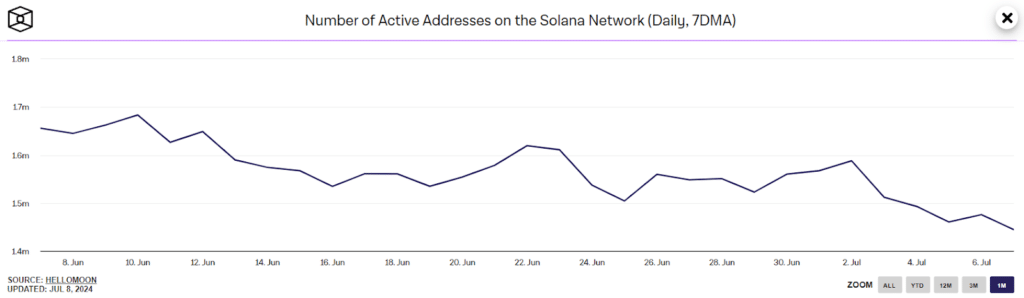 Pomimo tej zmienności, różne wskaźniki wykazują trend spadkowy. Dane on-chain odnotowały spadek liczby aktywnych adresów z tygodniowego maksimum 1,59 miliona do niedawnego minimum 1,44 miliona, co było wywołane ostatnim załamaniem rynku.
