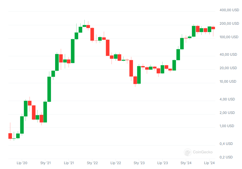 Wykres kursu kryptowaluty Solana, para SOL/USD, źródło: CoingeckoNa chwilę obecną większość poszlak wiążących blockchain Solana z amerykańskim wywiadem jest więc opartych na wątłych fundamentach. Wiele wskazuje na to, iż sieć stała się po prostu ofiarą własnego sukcesu- dynamiczna aprecjacja kryptowaluty spowodowała, iż wielu spekulantów zapakowanych w konkurencyjne projekty poszukuje powodów, aby odsądzić rozwiązania alternatywne od czci i wiary i w ten sposób zwrócić uwagę kapitału na swoje własne lokaty.