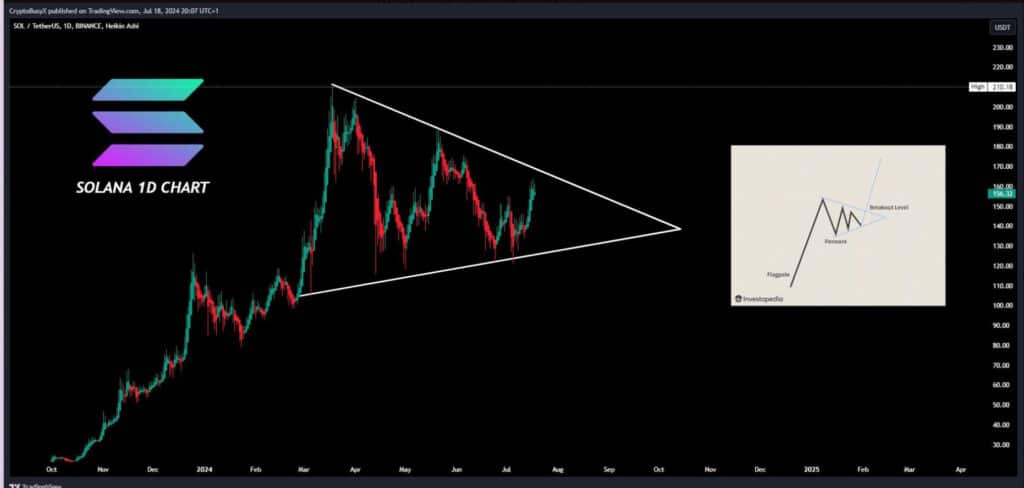 Inwestorzy kryptowalutowi zwracają baczną uwagę na Solana, ponieważ na jej wykresie cenowym widać w tej chwili wyraźnie tzw. „byczy proporczyk”.