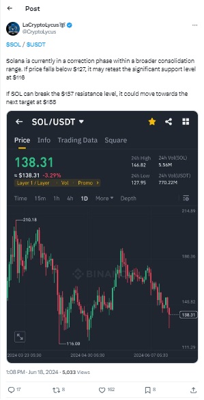 Analitycy, na podstawie aktualnych cen i wskaźników SOL, biorą pod uwagę możliwy spadek, w wyniku którego cena Solany może spaść do 116 dolarów. W wariancie, gdzie Solana zaczyna odrabiać straty, możliwe, iż przekroczy opór w okolicach 157 dolarów, co może utorować drogę do gwałtownego wzrostu.