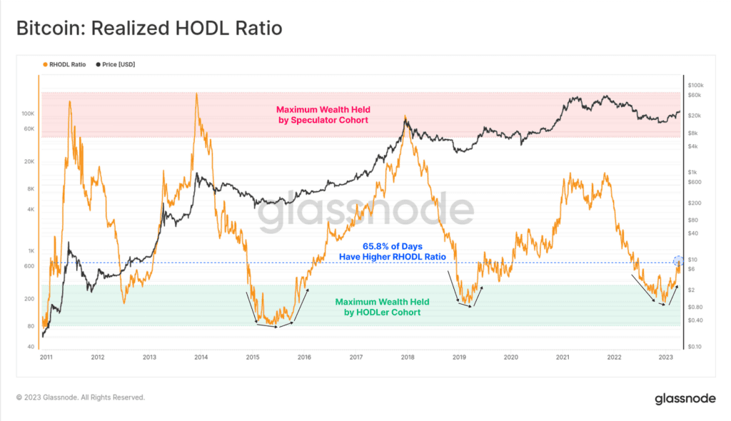 Źródło: GlassnodeWskaźnik RHODL jest w trakcie spadku od punktu szczytowego nasycenia HODLerami. Według metryki, cykl najprawdopodobniej obrócił się na korzyść byków. Na dłużej. Jednocześnie nie jest już na poziomach niedowartościowanych. Nie sięga też poziomu przewartościowania, mierzonego historycznymi standardami.
