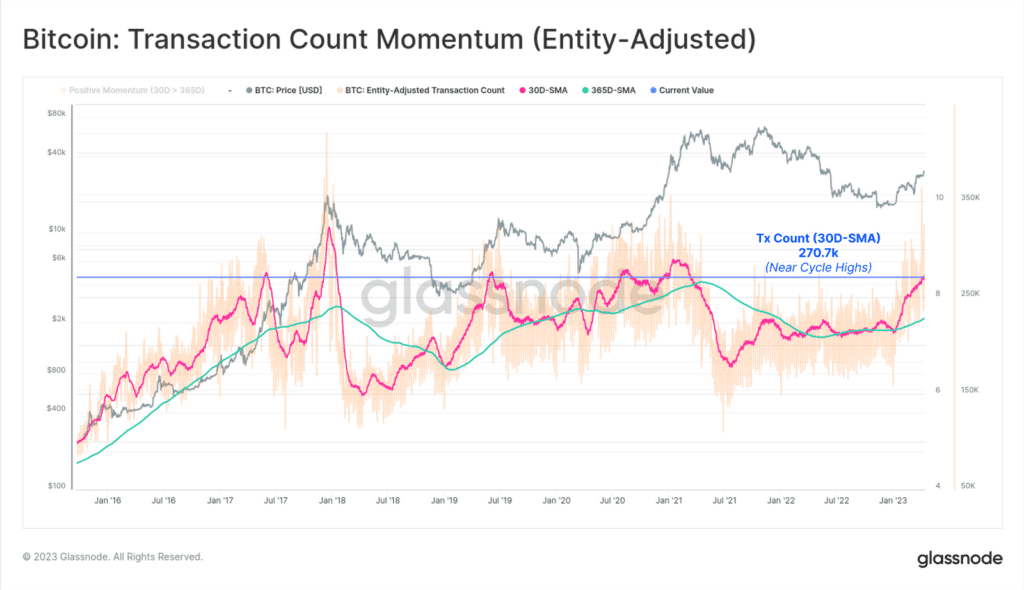 Źródło: GlassnodePodczas gdy HODLers są kojarzeni z uśpioną podażą cała sieć Bitcoin pozostaje wciąż ożywiona. Transakcje liczą w tej chwili średnio 270 tys. dziennie. Zbliżają się więc do cyklicznych, wysokich wartości na podstawie miesięcznej średniej. Wynika to pośednio z transferów BTC oraz pośrednio ekspansją BTC Ordinals oraz Inscriptions. W zeszłym tygodniu liczba Inscriptions przekroczyła 1 mln, potwierdzają rozwój organicznej aktywności w sieci.
