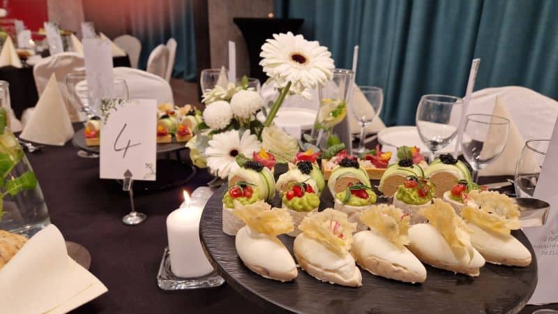 Po części oficjalnej uczestnicy zasiedli do uroczystej kolacji, przygotowanej przez Restaurację Panorama Wrocław, która zadbała o oprawę kulinarną wieczoru. Goście mieli okazję spróbować wykwintnych zakąsek, m.in. wędzonej gęsi z żurawiną i szparagami, musu parmezanowego z grzybami i piklowaną papryką, piersi drobiowej z orzechami i granatem oraz łososia w mascarpone z zielonym ogórkiem i kawiorem. Podano również krem z białych warzyw z chipsami z pietruszki i oliwą truflową.