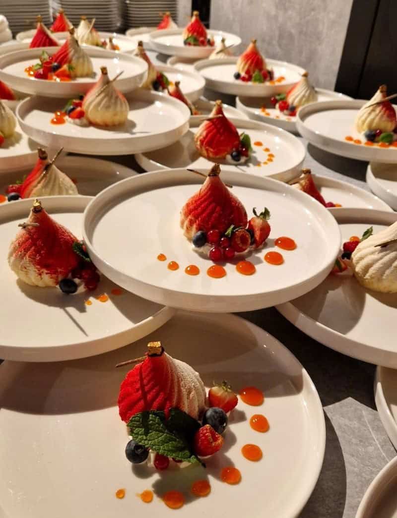 Dania główne serwowane były do wyboru: jagnięcina z batatem i dzikim brokułem, pieczony sandacz z ziemniakami fondant i purée z zielonego groszku lub ravioli z czosnkiem niedźwiedzim w sosie kurkowym z mascarpone. Na zakończenie wieczoru goście delektowali się lekkim, szampańskim musem z miętą, który stanowił eleganckie zwieńczenie kolacji.