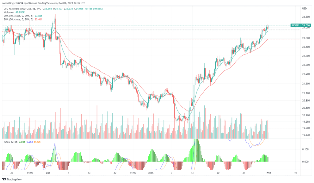 Srebro odnotowało w marcu znaczne wzrosty, zyskując ponad 3 USD, co jest najlepszym miesięcznym wynikiem od grudnia 2020. Majowe kontrakty terminowe na srebro notowane były w piątek na poziomie 24,235 USD za uncję. Oznacza to wzrost o 1% w ciągu dnia i prawie 4% w ciągu tygodnia.