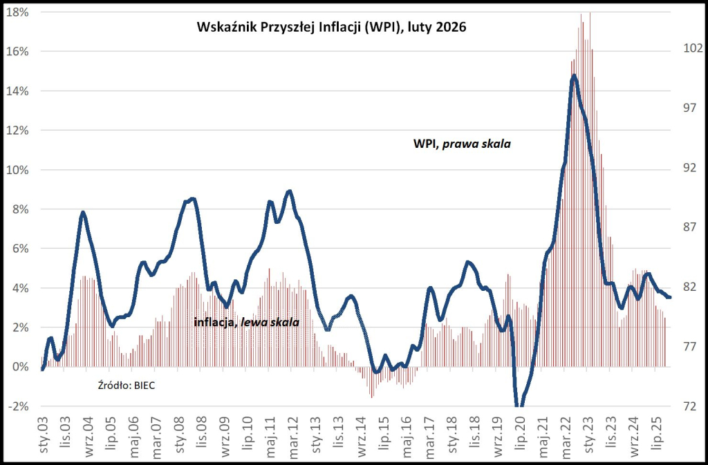 Z danych Biuro Inwestycji i Cykli Ekonomicznych wynika, iż Wskaźnik Przyszłej Inflacji w lutym 2026 roku utrzymał się na poziomie 81,1 pkt., czyli dokładnie takim samym jak w styczniu. Indeks ten ma charakter wyprzedzający i służy do prognozowania kierunku zmian cen konsumpcyjnych w kolejnych miesiącach.