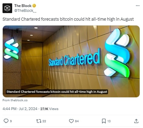 Na początku czerwca Kendrick powiedział, iż podtrzymuje swoją prognozę cen. Jak stwierdził Kendrick: „W szczególności cena 150 000 dolarów do końca 2024 r. sprawi, iż Bitcoin dołączy do klubu wartego 3 biliony dolarów pod względem kapitalizacji rynkowej, po osiągnięciu kapitalizacji rynkowej NVDA na poziomie 3 bilionów dolarów, która została osiągnięta wczoraj”.