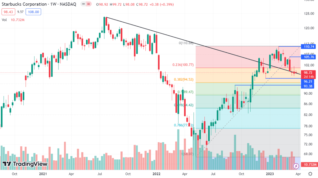Kurs Starbucks od kilku tygodni konsoliduje się przy przebitej wcześniej linii trendu spadkowego. Na razie wciąż przewagę mają byki. Wynika to z tego, iż wciąż trwa sekwencja wyższych szczytów i dołków. w tej chwili trwa spadkowa korekta impulsu wzrostowego, który trwa od maja 2022 roku. Bardzo ważnym poziomem jest lokalne maksimum na poziomie 101,5$. Jego przebicie otworzy szansę na rozpoczęcie kolejnej fali wzrostowej. Kolejny opór znajduje się w okolicy 106$.