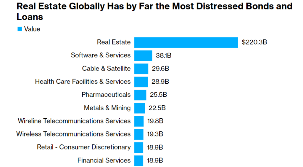 Nieruchomości na całym świecie mają zdecydowanie najwięcej zagrożonych obligacji i pożyczek. Źródło: BloombergKryzysowe wnioski