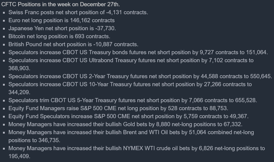 Zmiana pozycji według Federalnej Komisji Handlu (CFTC) w tygodniu zakończonym 27 grudnia. Instytucjonalni spekulanci zwiększyli niedźwiedzie pozycje na S&P 500 o 10%. Z kolei zarządzający portfelami nieznacznie zwiększyli bycze pozycje na S&P 500 (potencjalnie efekt coraz atrakcyjniejszych wycen akcji). Podobnie widzimy short na 2 i 10 letnich obligacjach skarbowych, on również wyniósł od 7 do 8%. Co interesujące – potężnie bycza, blisko 20% zmiana kontraktów na złoto – zarządzający portfelami prognozują dobry początek roku dla metali szlachetnych. Widzimy też dynamiczny wzrost byczych zakłady na ropie brent – prawdopodobnie efekt otwarcia chińskiej gospodarki i poprawy sentymentu wokół rynków wschodzących (choć covid wciąż zagraża) oraz pośrednio być może zagrożenia kolejnymi konfliktami zbrojnymi w 2023. (Iran – Izrael, przedłużająca się wojna w Ukrainie, wciąż niepewny Tajwan). Nieco słabiej wyglądała zmiana kontraktów dla teksańskiej ropy WTI, notowanej na NYMEX. Źródło: CFTC, FJTak zaczynając przejdźmy dalej: