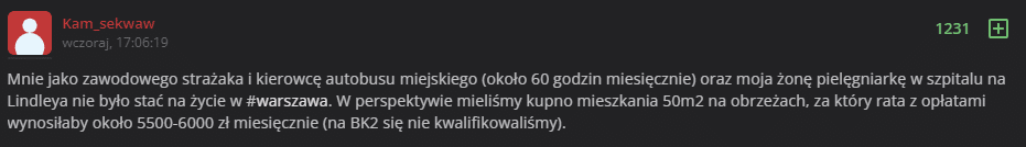 Kam_sekwaw to, jeżeli wierzyć jego słowom, zawodowy strażak, który poza swoją służbą w Polsce dorabiał jako kierowca autobusu miejskiego. Jego żona pracowała z kolei jako pielęgniarka w warszawskim szpitalu. „Mnie jako zawodowego strażaka i kierowcę autobusu miejskiego (około 60 godzin miesięcznie) oraz moją żonę pielęgniarkę w szpitalu na Lindleya nie było stać na życie w Warszawie” – pisze użytkownik. Dla wielu młodych rodzin w Polsce marzenie o własnym mieszkaniu w dużym mieście staje się coraz bardziej nieosiągalne z powodu gigantycznej presji kosztowej, a dla autora i jego żony perspektywa kupna mieszkania oznaczała życie na granicy wytrzymałości finansowej. „W perspektywie mieliśmy kupno mieszkania 50m2 na obrzeżach, za który rata z opłatami wynosiłaby około 5500-6000 zł miesięcznie”.