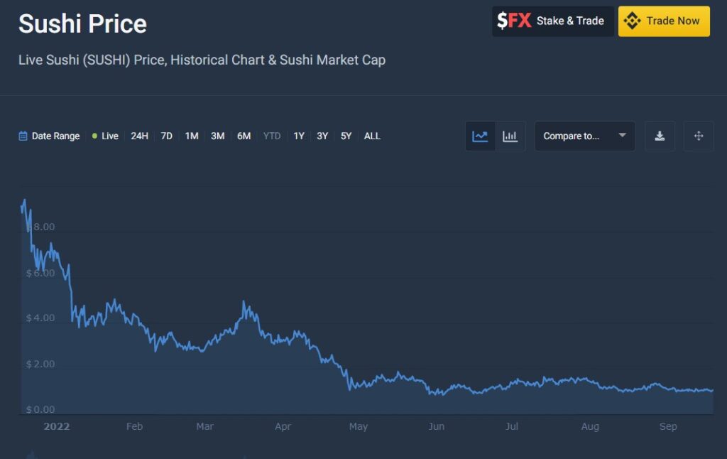 Sam token – SUSHI – jest w tej chwili wyceniany na 1,12 dol. i brakuje mu aż 95% do swojej rekordowej wyceny z marca 2021 r., kiedy kosztował aż 23,38 dol.