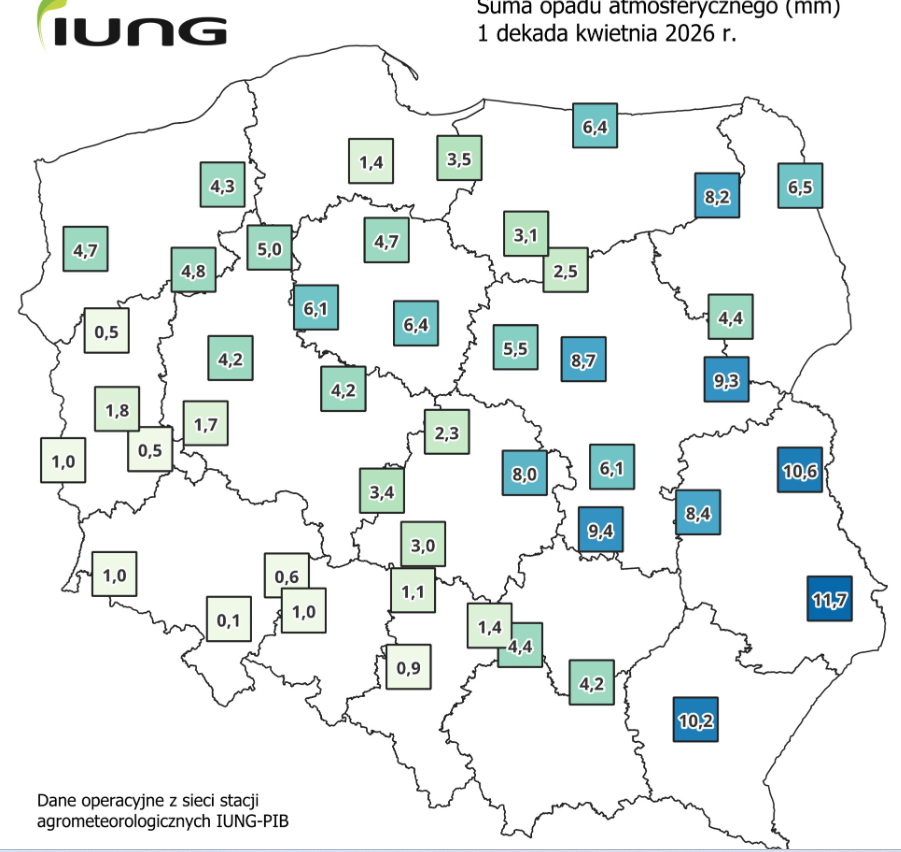 Sytuacja meteorologiczna w kwietniu 2026 roku budzi poważne obawy. Dane IUNG-PIB pokazują, iż opady pozostają bardzo ograniczone, a w wielu regionach kraju niemal symboliczne. Na południowym zachodzie suma opadu nie przekroczyła 2 mm, natomiast na wschodzie osiągnęła maksymalnie około 12 mm. Jednak choćby te wyższe wartości nie poprawiają sytuacji glebowej.