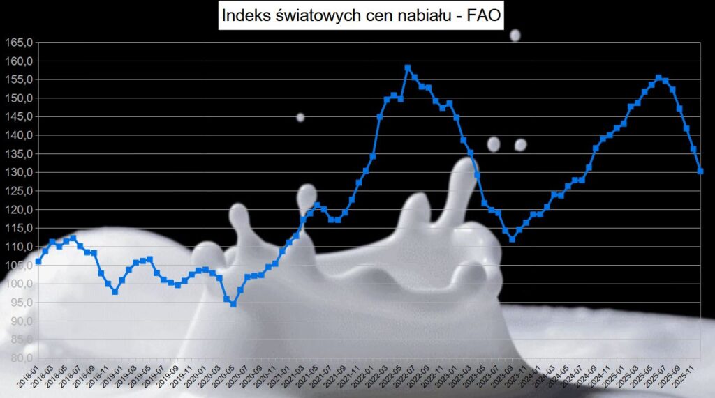 Rok 2025 zapisał się w historii sektora mleczarskiego jako czas wyjątkowej zmienności i rynkowych kontrastów. Globalne ceny mleka, mierzone Wskaźnikiem Cen Produktów Mlecznych FAO, przeszły gwałtowną drogę – od silnych wzrostów napędzanych ożywionym popytem w pierwszym półroczu, aż po drastyczną korektę w grudniu. Średnia roczna wartość indeksu na poziomie 146,9 punktu (o 13,2% wyższa niż w 2024 r.) maskuje trudną końcówkę roku, w której rynek musiał zmierzyć się z sezonową nadpodażą i akumulacją zapasów w Europie oraz Oceanii.