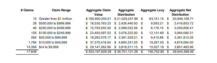 Z zawiadomienia wynika, iż 17 648 wierzycieli zgłosiło roszczenia o wartości 305,6 mln dolarów. kanadyjskich (223 mln USD).