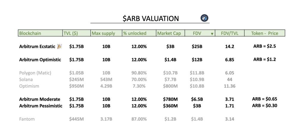 Źródło: ByBitJak w przyszłości może kształtować się dynamika cenowa monet Arbitrum? To zależy od kilku czynników. Odrzucając na samym początku czynniki takie jak ogólny sentyment rynkowy, lepiej przyjąć pewne pomocne założenia, takie jak prawdopodobieństwo, iż 1) $ARB będzie wyceniane co najmniej częściowo jak podobne, konkurencyjne projekty oraz iż 2) weźmiemy pod uwagę FDV, czyli „w pełni rozwodnioną” kapitalizację (to innymi słowy całkowita kapitalizacja projektu zakładająca iż na chwilę obecną wszystkie wymintowane tokeny trafiłyby jednocześnie na rynek). Następnie należy przyjąć kilka możliwych scenariuszy (na przykład euforyczny, optymistyczny, umiarkowany i pesymistyczny).