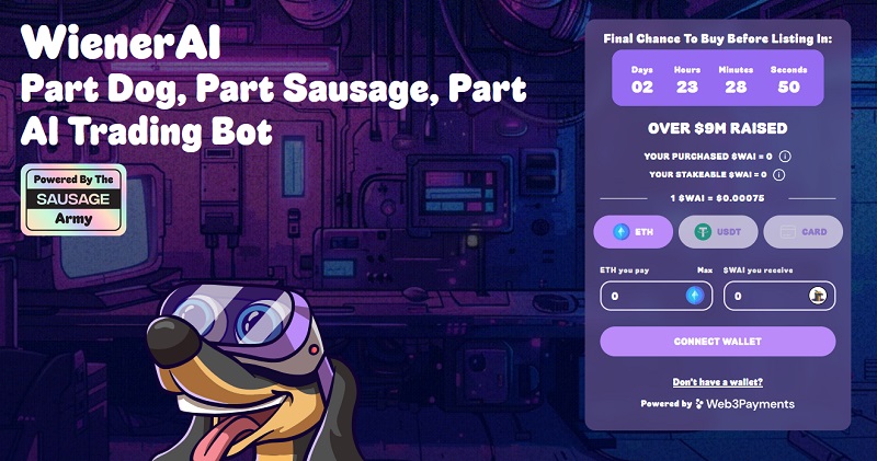 WienerAI to projekt łączący sztuczną inteligencję z memecoinami. Przede wszystkim należy spojrzeć na użyteczność tego projektu. Jest to bowiem bot tradingowy, który może pomóc uzyskać przewagę na rynku podczas inwestowania w kryptowaluty.