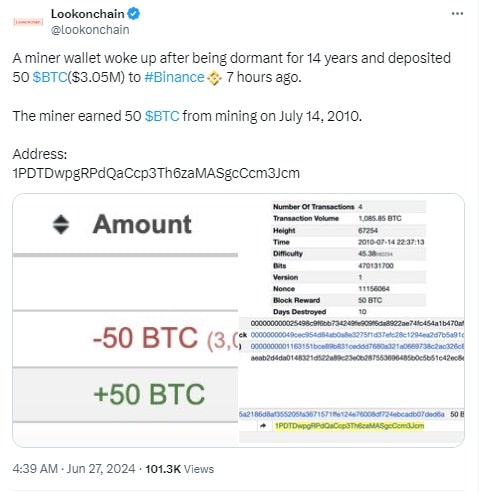 Firma analityczna Lookonchain, zajmująca się analizą blockchain, poinformowała, iż nieaktywny przez 14 lat portfel BTC wykonał ruch. Ze wstępnych analiz wynika, iż portfel prawdopodobnie należy do górnika, który otrzymał 50 BTC jako nagrodę za wydobycie 14 lipca 2010 r., czyli zaledwie kilka miesięcy po uruchomieniu sieci Bitcoin. W tamtym momencie jeden BTC był wyceniany na zaledwie 0,003 dolara.