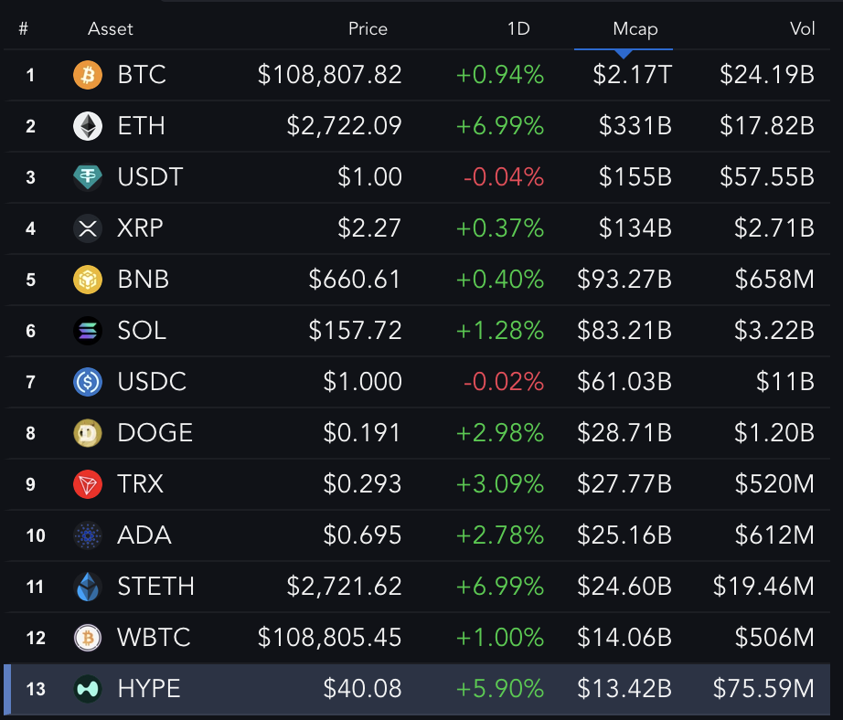 Potencjalny listing na Binance zbliża się dla trzech z najbardziej popularnych tokenów na rynku: HYPE, SPX6900 i AERO. HYPE od Hyperliquid przekroczył 40 USD i jest teraz w pierwszej dziesiątce aktywów kryptowalutowych pod względem kapitalizacji rynkowej. Wspierają go silne przychody i dominacja na rynku kontraktów wieczystych.