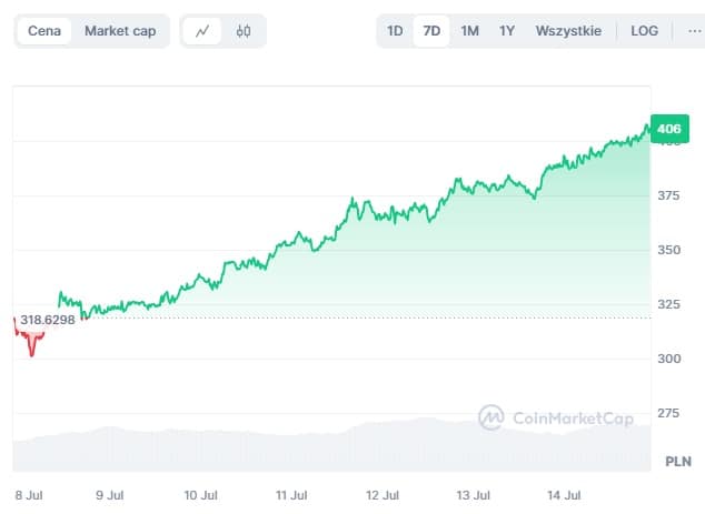 W ostatnim tygodniu jednym z takich cichych bohaterów był Aave. Altcoin zyskał na wartości w ujęciu tygodniowym aż 25% i w momencie pisania tekstu kosztuje około 103 dolary. Jej kapitalizacja rynkowa wynosi w tej chwili 1,52 miliarda dolarów, co czyni ją 53. co do wielkości kryptowalutą. Ostatni raz taki rajd kryptowaluta odnotowała w maju.