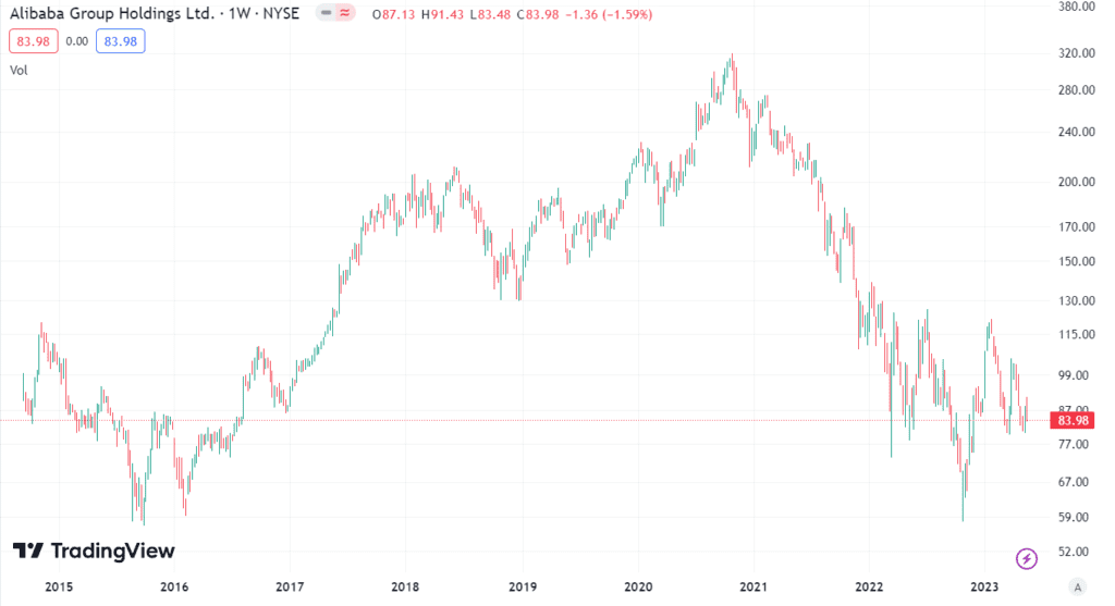 Jak widać, otoczenie nie wspiera kursu chińskiego giganta. W październiku 2020 roku notowane ADR-y spółki Alibaba były wyceniane na około 310$. w tej chwili kurs akcji wynosi około 84$.