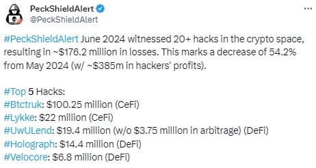 Źródło: https://x.com/PeckShieldAlert/status/1807662261148029227Według zestawienia, które przygotował Peckshield, największy incydent hakerski wymierzony był w turecką giełdę kryptowalut BtcTurk. W wyniku tego ataku hakerzy ukradli aktywa o wartości ponad 100 milionów dolarów. Drugą największą ofiarą w czerwcu była Lykke (CeFi), która straciła 22 miliony dolarów w aktywach kryptograficznych, dodał. Inne zdecentralizowane giełdy kryptowalut, takie jak Uwu Lend, Holograph i Velocore straciły łącznie 40,6 dolarów na rzecz hakerów.