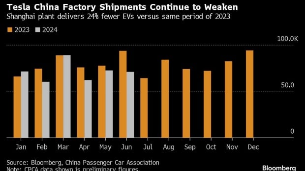 Produkcja samochodow w fabryce w Chinach (Szanghaj) spadła o 24% r/r. Słabszy rynek w Chinach jest zagrożeniem dla ekspansji biznesu Muska. Źródlo: BloombergMelodia przyszłości