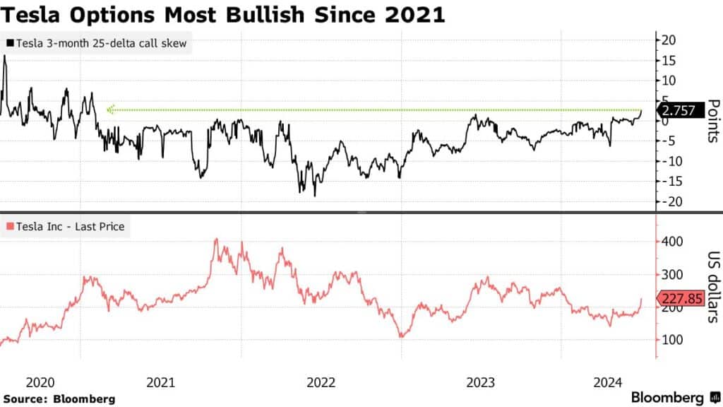 Rynek opcji jest najbardziej byczy na akcjach Tesli, od 2021 roku. Źródło: Bloomberg Wyższe dostawy i … Po prostu Elon Musk