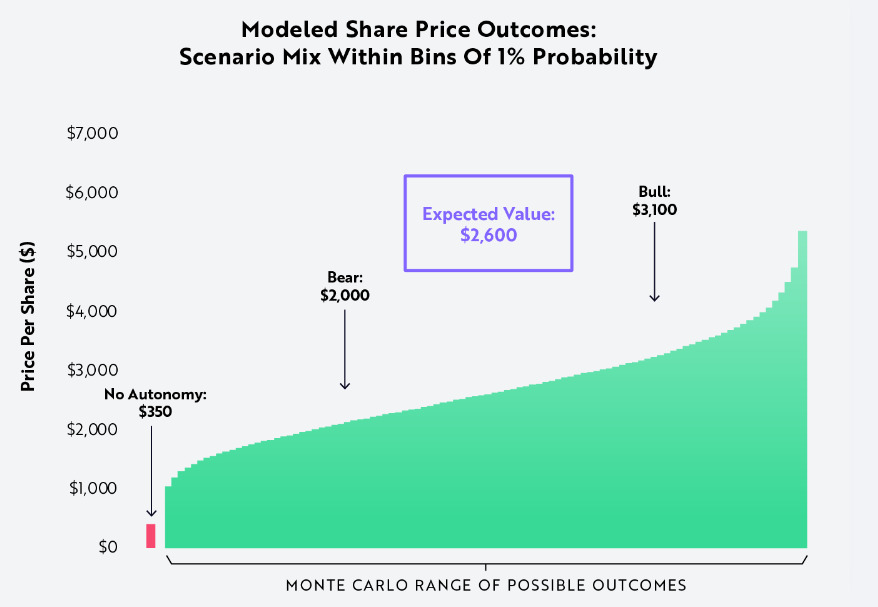 W czerwcu fundusz Ark Invest zaprezentowal prognozę cen akcji Tesli, na rok 2029. W najbardziej ponurym scenariuszu, przy użyciu metody Monte Carlo, analitycy spodziewają się 2000 USD za walor. Zdaniem Ark Invest będzie to prawdopodobnie 2600 USD. W 2029 roku firma zdecydowaną większość zysków ma generować z wysokomarżowej sprzedaży 'Robotaxi’ i technologii. Fundusz Ark znany jest jednak z tworzenia wielu, często przesadnie optymistycznych prognoz. Tym razem będzie inaczej?