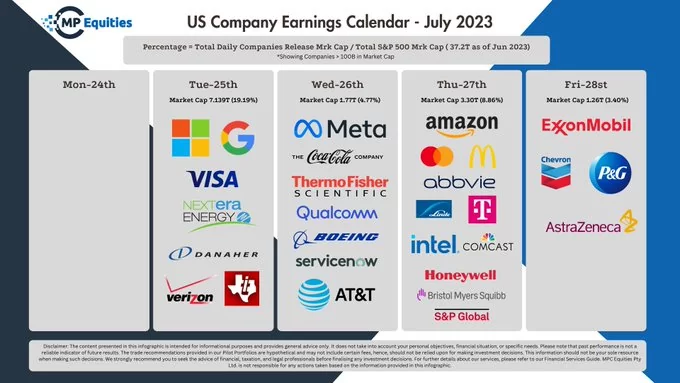 Niesamowity rajd spółek technologicznych dni łapie zadyszkę przed zbliżającą się publikacją wyników kluczowych firm z Wall Street. W przyszłym tygodniu łączna kapitalizacja amerykańskich firm, które podzielą się wynikami finansowymi przekroczy 25 bilionów dolarów. W związku z tym spodziewamy się szczytu zmienności i być może znalezienia decydującego kierunku. Wśród spółek, których raporty za II kwartał 2023 roku poznamy znajdą się m.in. we wtorek: Microsoft (największa waga w Nasdaq), Alphabet (Google) i Visa czy środowe Coca Cola i Meta Platforms i czwartkowy Amazon oraz McDonald’s. Trzy giganty przedstawią raporty w ciągu jednego dnia, 25 lipca.W pozostałych także nie będzie nudno. Spółki z S&P 500 odnotowały spadki zysków w dwóch kolejnych kwartałach ale … Do tej pory blisko 80% z nich pokonuje poprzeczkę postawioną przez analityków.