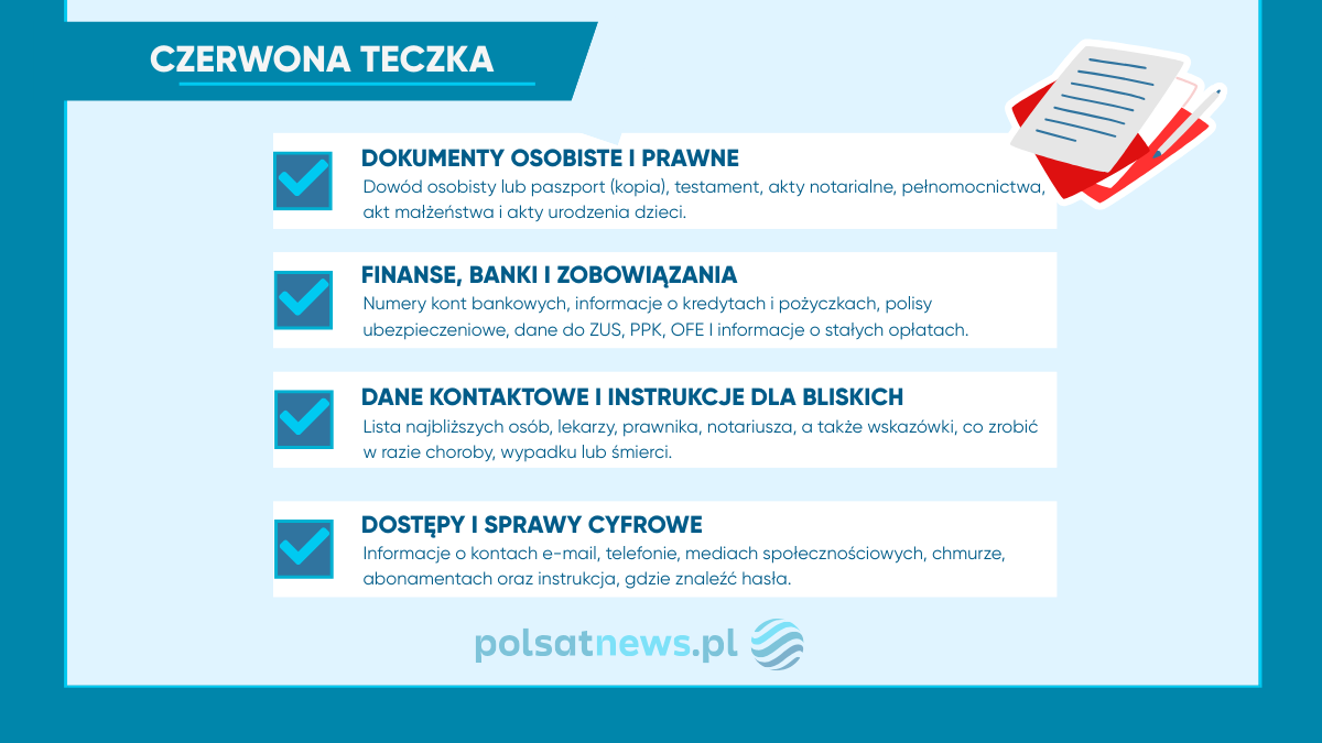 Posiadanie testamentu to dobry krok w planowaniu przyszłości, ale samo sporządzenie ostatniej woli nie wystarczy, by ułatwić bliskim załatwienie wszystkich formalności w trudnych chwilach. Coraz częściej eksperci zwracają uwagę na tzw. czerwoną teczkę - zestaw najważniejszych dokumentów, które warto przygotować z wyprzedzeniem na wypadek nagłej choroby, wypadku lub śmierci.