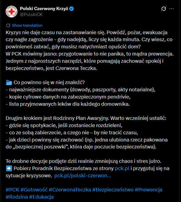 W styczniu 2026 roku Polski Czerwony Krzyż poinformował w swoim poście na platformie X: "W PCK mówimy jasno: przygotowanie to nie panika, to mądra prewencja. Jednym z najprostszych narzędzi, które pomagają zachować spokój i bezpieczeństwo, jest Czerwona Teczka"
