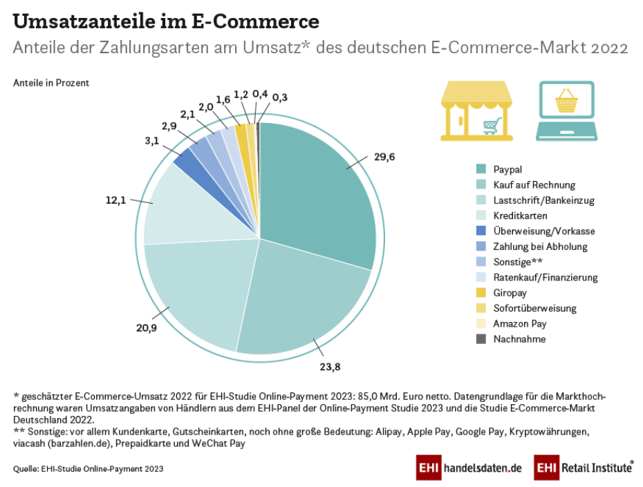 PayPal w 2022 miał 29,6% udział w niemieckim e-commerce. Dla przykładu Amazon Pay 0,4%, karty kredytowe 20,9%. Źródło: EHIhandelsdaten.deKonkurencja nie śpi