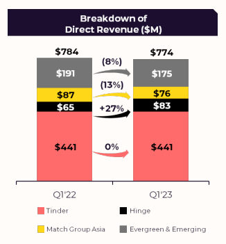 Najważniejszą aplikacją Match Inc jest Tinder. Przychody Tindera wyniosły w I Q 2023 roku 441 mln$ i nie wzrosły w ciągu roku. Jest to negatywny sygnał. Oznacza to, iż Tinder ma coraz trudniej na rynku. Skoro Hinge potrafi zwiększyć przychody, a Tinder nie możliwe, iż część użytkowników decyduje się na zaprzestanie korzystania z subskrypcji i przenoszeniu się na inne platformy.