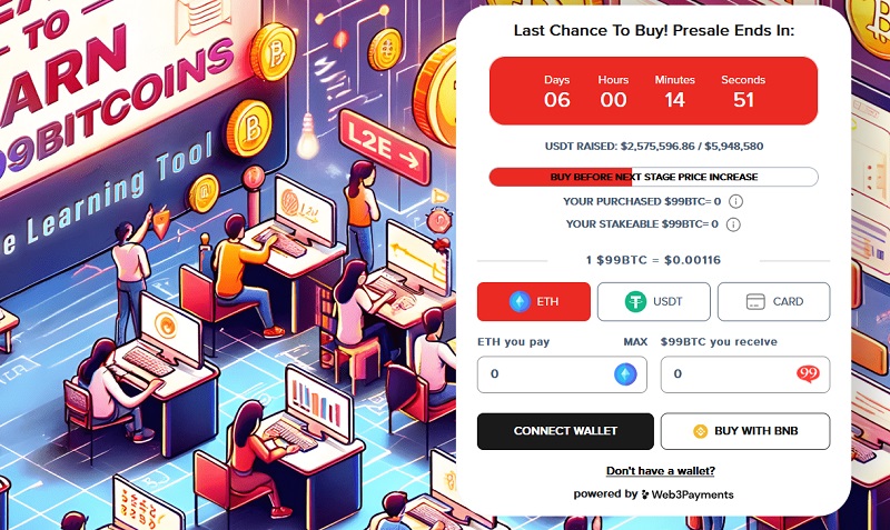 Jeżeli choćby wzrost nie będzie tak okazały, użyteczność i potencjał zachęcają inwestorów do zakupu tokenów $99BTC. Szczególnie iż jest to szybkie i proste. Wystarczy podłączyć portfel kryptowalutowy, a następnie wymienić waluty cyfrowe Ethereum (ETH), Tether (USDT) czy Binance Coin (BNB) na tokeny $99BTC. Istnieje też możliwość zapłaty kartą bankową.