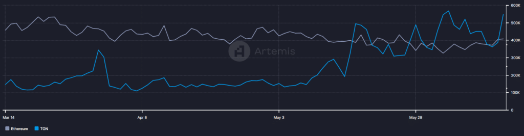 Dziennie aktywne adresy (DAA) to miara unikalnych portfeli angażujących się w transakcje na blockchainie każdego dnia. Od 17 maja TON i Ethereum ostro walczyły o miejsce na podium pod względem współczynnika DAA, jednak początkiem czerwca to właśnie TON wysunął się na czoło wyścigu, pokonując Ethereum przez aż 10 z pierwszych 11 dni tego miesiąca. 3 czerwca TON osiągnął rekordowy poziom 568 300 dziennych aktywnych adresów, co stanowi poziom, którego Ethereum nie doświadczyło aż od września zeszłego roku.