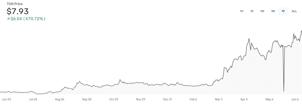 — Ali (@ali_charts) June 13, 2024W momencie powstawania powyższego artykułu TON był wyceniany na wolnym rynku na kwotę 8,03 dolarów za sztukę, przy wzroście o 6,63% w ciągu ostatnich 24 godzin.