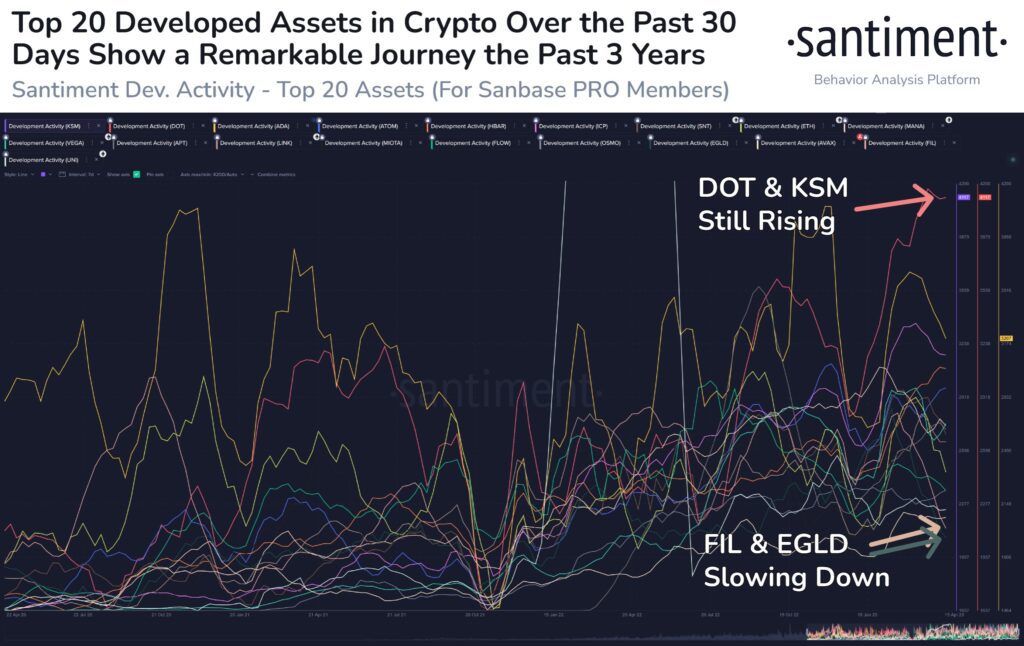 Analizując trzy najlepsze kryptowaluty w oparciu o aktywność rozwojową za pośrednictwem commitów na platformie GitHub w ciągu ostatnich 30 dni, Polkadot (DOT) i Kusama (KSM) wyróżniają się zdecydowanie na tle pozostałych. Ich linie trendu wskazują na stały wzrost, co sugeruje aktywne wysiłki w celu wzmocnienia ich sieci i ekosystemów.