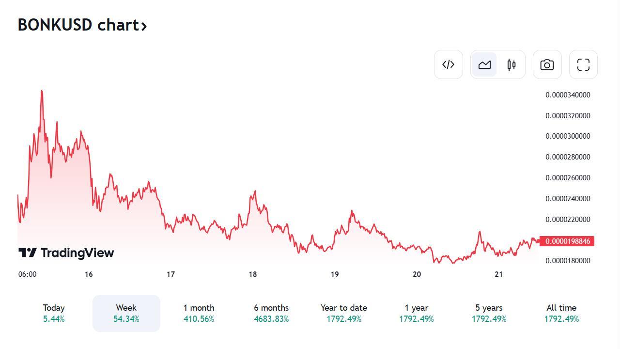 Bonk (BONK), memiczna kryptowaluta opracowana na blockchainie Solana, zyskała ostatnio znaczną popularność. Bonk (BONK) doświadczył niezwykłego wzrostu, a jego wartość wzrosła o ponad 703,97% w ciągu ostatnich 30 dni i zdumiewające 13 623,88% w ciągu 90 dni. Ten błyskawiczny wzrost sprawił, iż Bonk (BONK) zajął znaczącą pozycję wśród projektów kryptowalutowych, podkreślając jego zmienność i spekulacyjny charakter monet memowych.