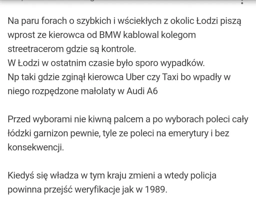 – Nie możemy podawać niesprawdzonych informacji – mówiła w poniedziałek, 25 września br. Aneta Sobieraj, rzeczniczka łódzkiej policji. – Mogę podkreślić z całą stanowczością, iż doniesienia, iż w zdarzeniu miał brać udział policjant, są absolutnie nieprawdziwe i uderzają w dobre imię policji – dodała.