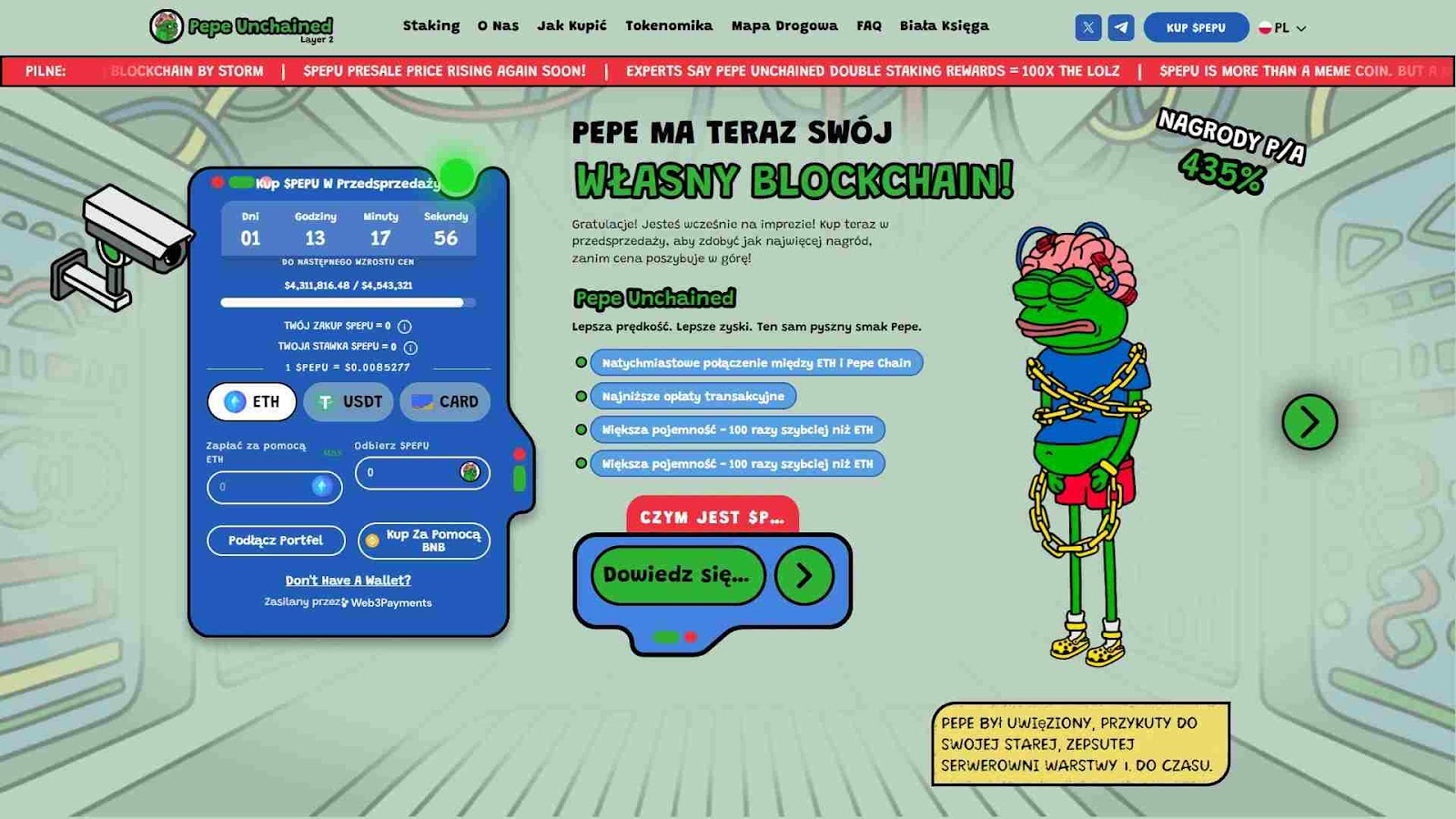 Przedsprzedaż Pepe Unchained zebrała już prawie 4,5 miliona dolarów, a cena PEPU wynosi teraz jedyne 0,0084937 USD. Projekt łączy w sobie trendy świata kryptowalut, czyli rozwiązanie warstwy 2 oraz memecoina. Pepu, z użytecznością wykraczającą poza zwykłego memecoina, uchodzi za ciekawą opcję inwestycyjną na kolejny byczy rajd.