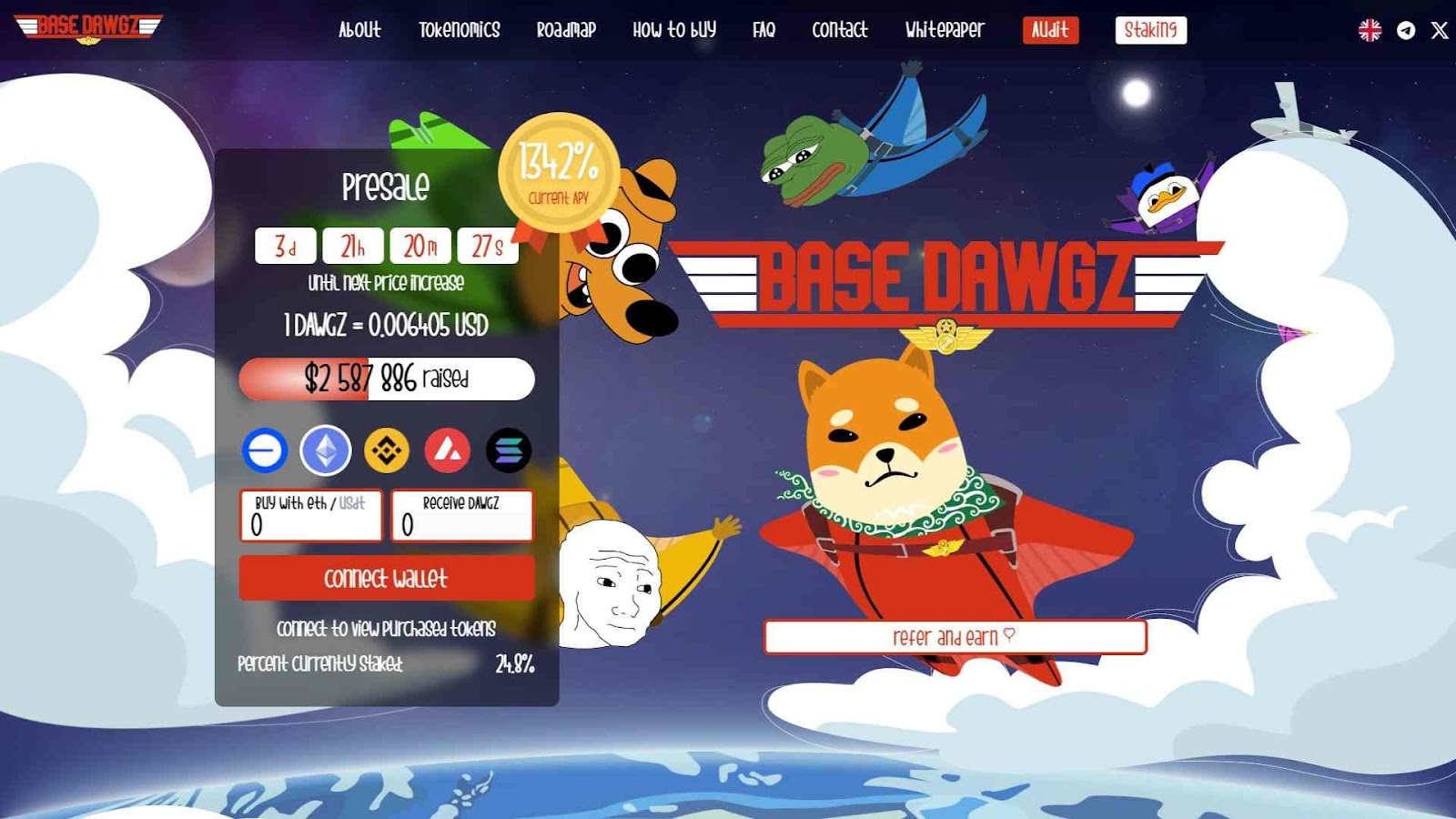 Co więcej, Base Dawgz oferuje staking z wysoką roczną stopę procentową (RRSO). W ten sposób projekt stara się zachęcić do długoterminowego trzymania tokenów. w tej chwili RRSO wynosi aż 1341,8%. Mechanizm pozwala inwestorom na uzyskanie znacznego dochodu pasywnego.