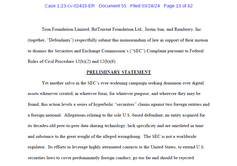 Tron Foundation złożyła do nowojorskiego sądu federalnego wniosek o oddalenie pozwu SEC. Argumentuje, iż zarzuty, które SEC formułuje, odnoszą się do kwestii poza granicami USA – w stosunku do których nie powinna ona mieć nic do powiedzenia. Sprawa wpisuje się w szerszy problem polegający na tendencji niektórych instytucji do arbitralnego rozszerzania zakresu swojej władzy.