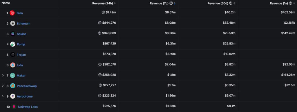 Jak podaje serwis DefiLlama, Tron zgromadził 1,42 miliona dolarów przychodu w ciągu ostatnich 24 godzin, w porównaniu do 844 276 dolarów Ethereum w tym samym okresie.