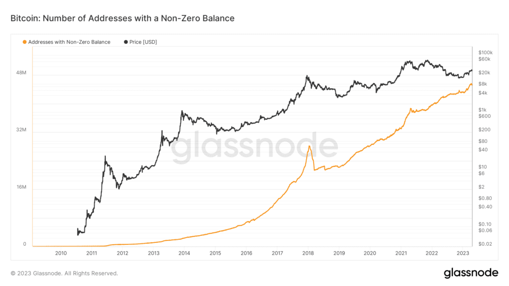 To przyciągnęło wielu ludzi do kupowania Bitcoina jako sposobu na zrekompensowanie dewaluacji walut fiducjarnych i nadmiernego drukowania pieniędzy przez banki centralne na całym świecie. Na przykład liczba niezerowych adresów Bitcoin wzrosła z około 2500 w 2009 roku do ponad 45 milionów w 2023 roku, według Glassnode.