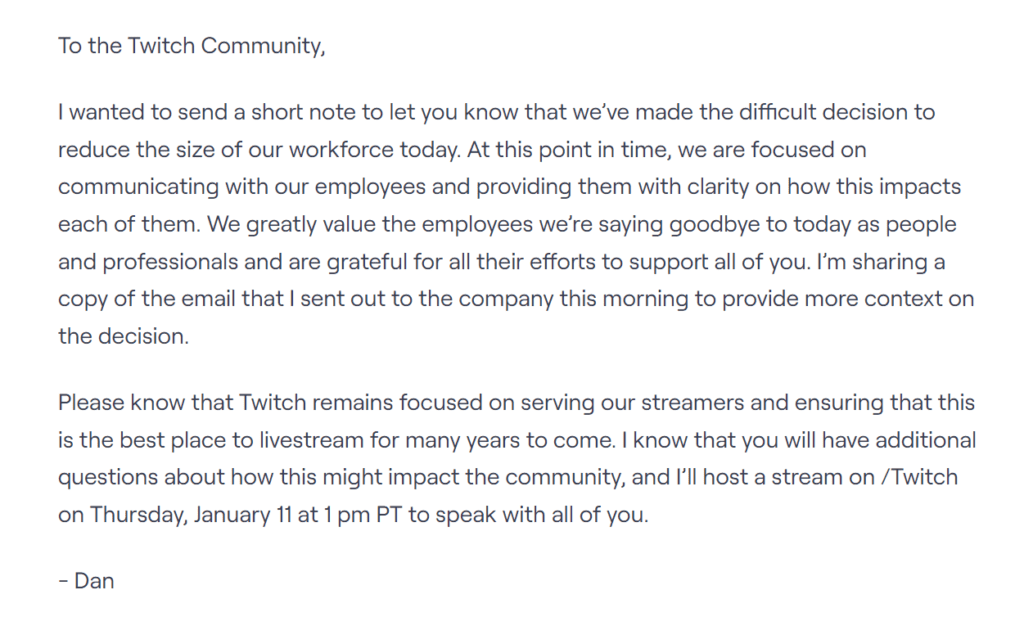 Twitch charakteryzuje decyzję o zwolnieniach jako „nieprawdopodobnie trudną i bolesną” – i z pewnością taką jest, tyle iż nie dla firmy, a dla zwalnianych. Kierownictwo nie powstrzymało się przy tej okazji przed wyrażeniem niezadowolenia, iż ktoś dokonał przecieku informacji o zwolnieniach. Oficjalnie – dlatego iż „spowodowała zaniepokojenie” pośród pracowników. Które jednak, jak się okazało, było jak najbardziej uzasadnione.