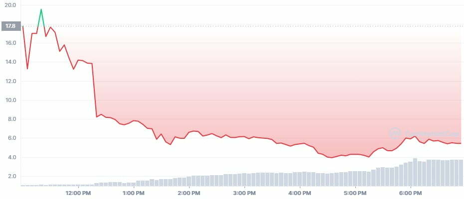 W niniejszym materiale nie mogło rzecz jasna zabraknąć publikacji wykresu nowo narodzonej, najmłodszej córki Do Kwona. Należy mieć na uwadze, iż wykres ze strony CoinMarketCap nie jest kompletny – ceną startową Luny 2.0 było bowiem 30$!