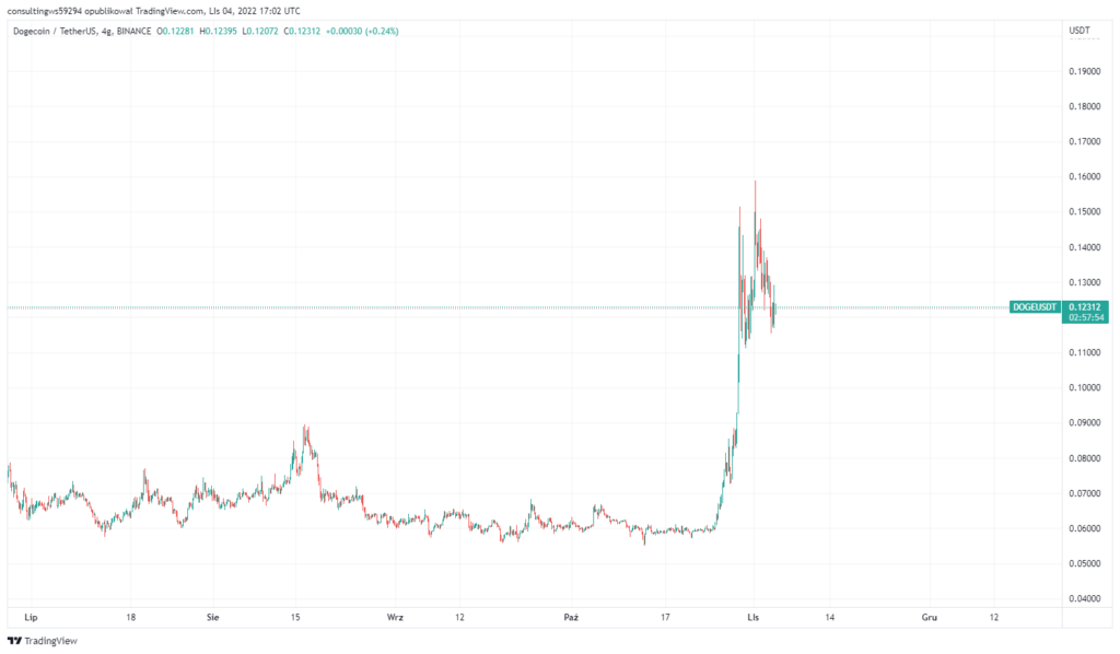DOGE działa jako uzupełnienie sentymentu rynkowego do nowego właściciela Twittera Elona Muska od początku 2021 roku. Gdy Musk zakończył zakup Twittera pod koniec października i przyjął firmę stając się jej właścicielem, cena Dogecoina wzrosła ponad dwukrotnie, a wielu spodziewało się, iż sytuacja ta popchnie nowe inicjatywy kryptograficzne w ramach restrukturyzacji platformy.