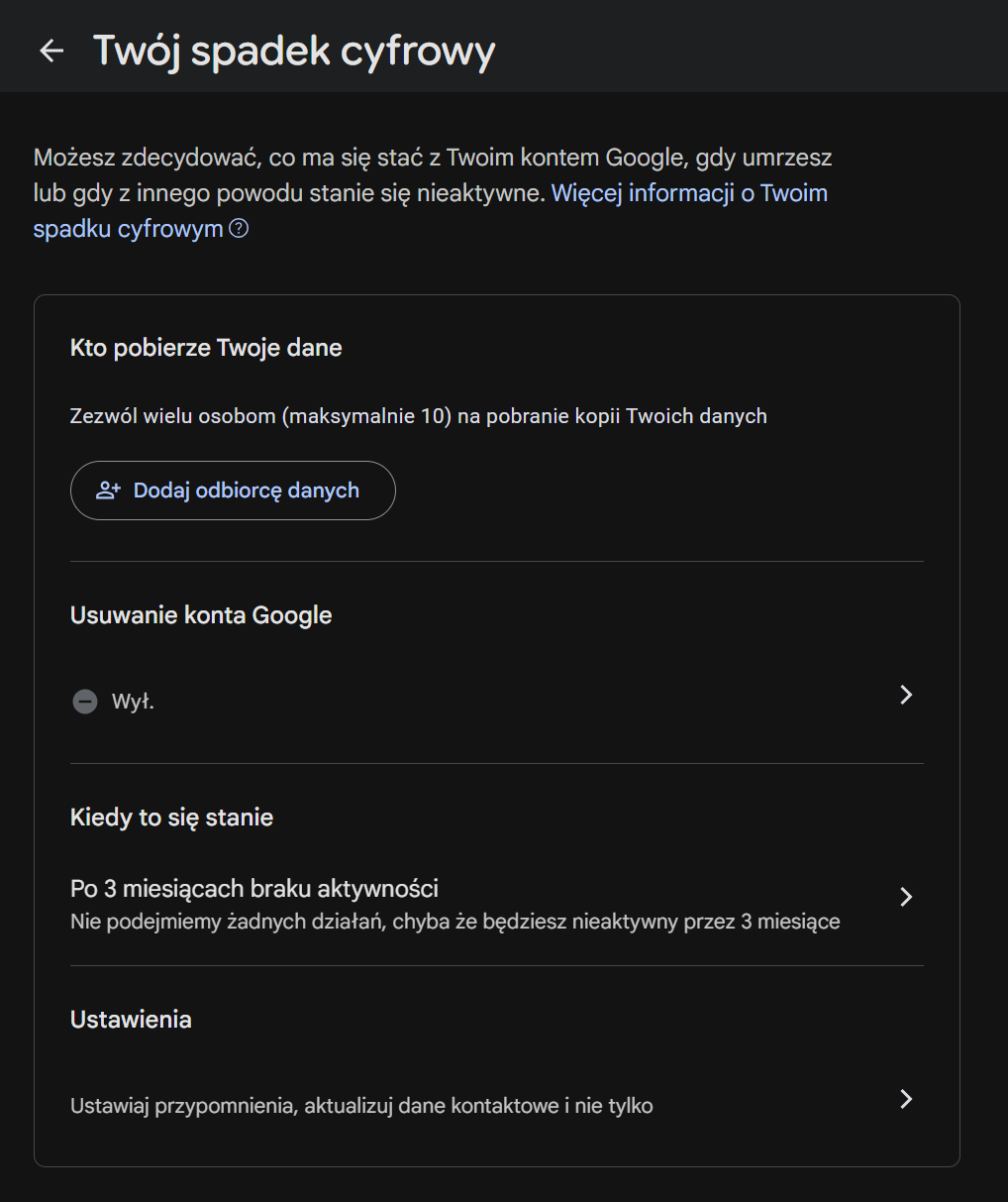 - Dla użytkowników Google: uaktywnij Menedżera nieaktywnych kont Google (możesz to zrobić z poziomu przeglądarki na dowolnym urządzeniu). Oczywiście musisz być zalogowany w danej przeglądarce na swoje konto Google. To system, który po określonym czasie braku aktywności (np. po 3, 6 lub 12 miesiącach, ty ustawiasz po jakim czasie) automatycznie przekaże dostęp do wybranych usług (np. poczty Gmail, Dysku czy Zdjęć) wskazanym przez Ciebie osobom (możesz dodać do 10 kontaktów). Aby dodać zaufaną osobę klikasz Dodaj odbiorcę danych.